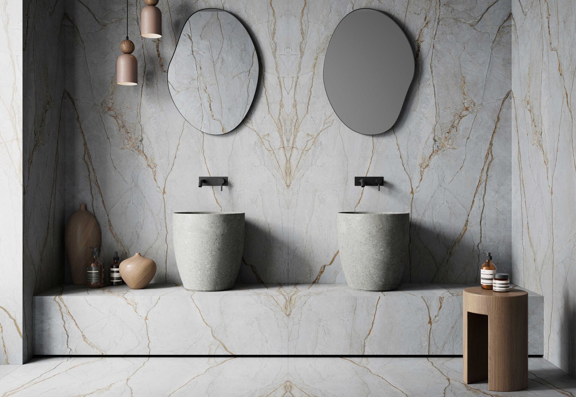 Foresta Blue naît de l’inspiration de la pierre Blue Roma, reconnue pour la force de son bleu grisâtre traversé de veines cuivrées.